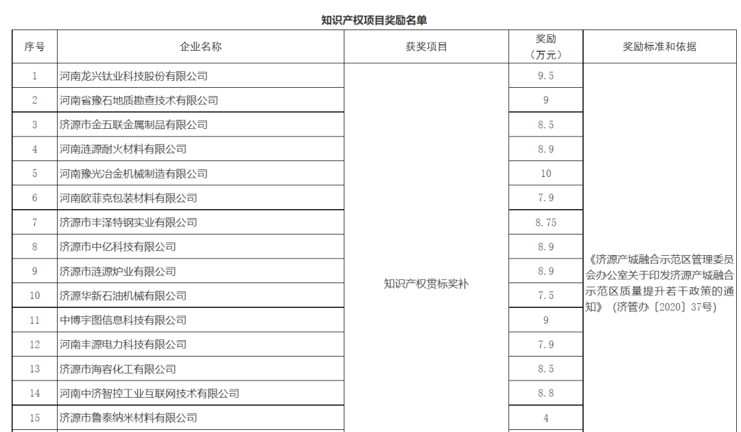 為進一步推進質量強市建設,優(yōu)化營商環(huán)境,激勵各單位、企業(yè)和個人開展質量提升工作,充分發(fā)揮財政資金對質量發(fā)展的促進和導向作用,全面提升質量水平,提高企業(yè)核心競爭力,加快培育競爭新優(yōu)勢,建設創(chuàng)新型高品質現(xiàn)代化示范區(qū),按照《中共濟源市委濟源市人民政府關于開展質量提升行動的實施意見》(濟發(fā)〔2018〕22號)和《濟源產城融合示范區(qū)管理委員會辦公室關于印發(fā)濟源產城融合示范區(qū)質量提升若干政策的通知》(濟管辦〔2020〕37號)的規(guī)定,決定對取得2021年度質量成果的單位、企業(yè)和個人予以通報獎勵補助。