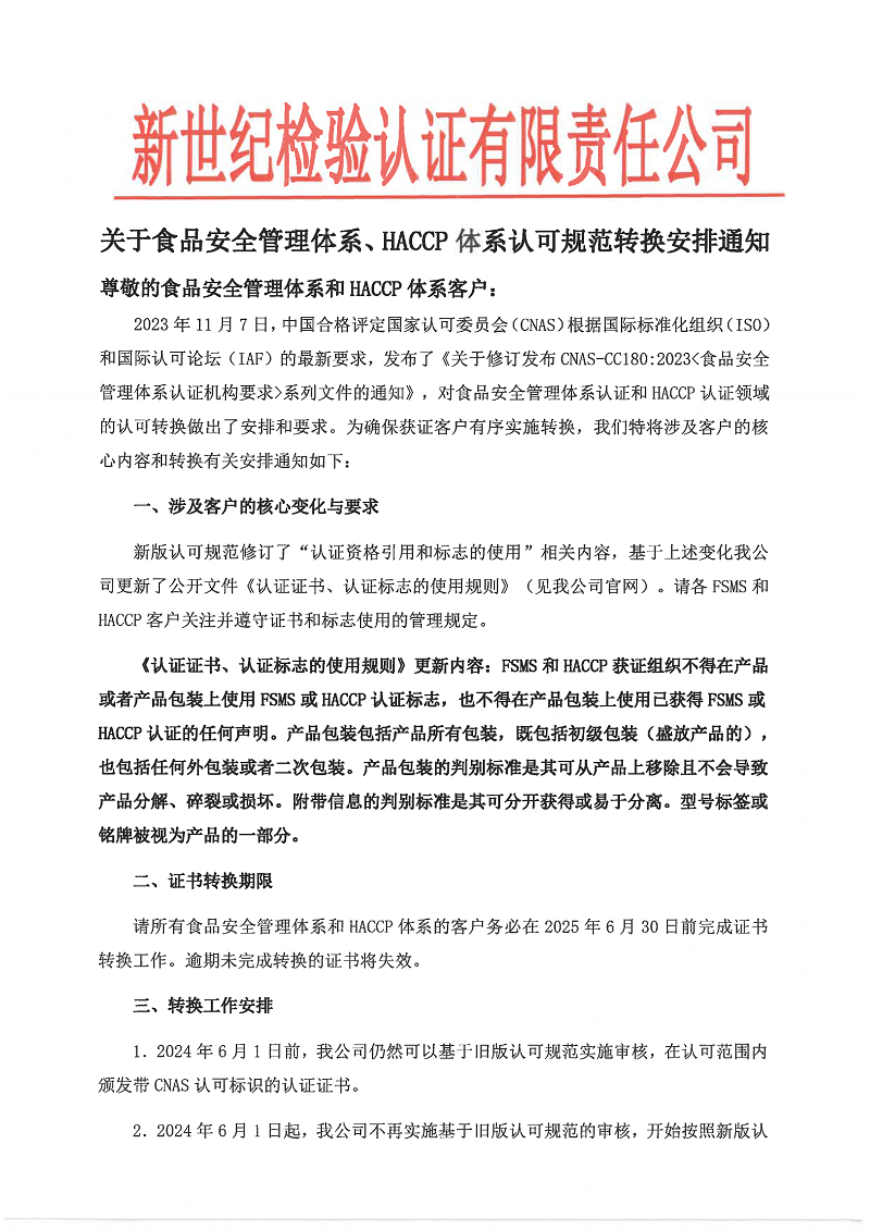 請所有食品安全管理體系和HACCP體系的客戶務(wù)必在2025年6月30日前完成證書轉(zhuǎn)換工作。逾期未完成轉(zhuǎn)換的證書將失效。