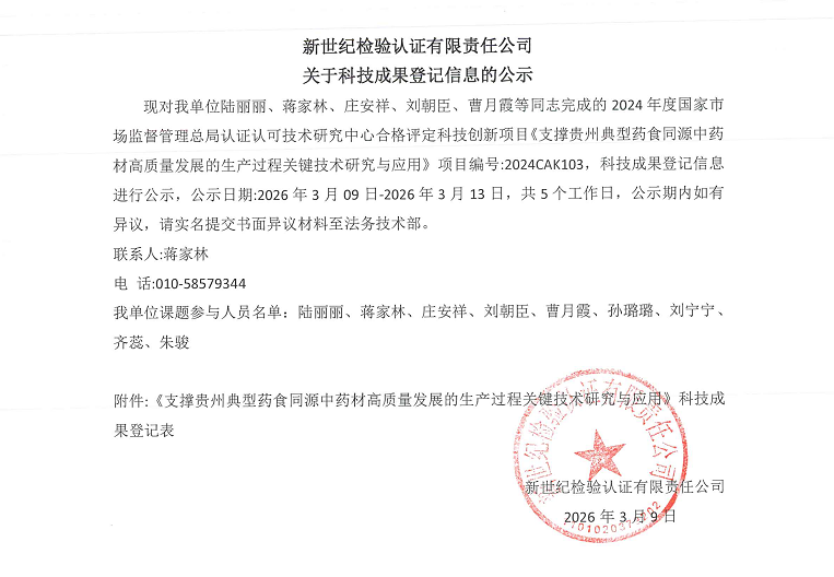 現(xiàn)對(duì)我單位陸麗麗、蔣家林、莊安祥、劉朝臣、曹月霞等同志完成的2024年度國(guó)家市場(chǎng)監(jiān)督管理總局認(rèn)證認(rèn)可技術(shù)研究中心合格評(píng)定科技創(chuàng)新項(xiàng)目《支撐貴州典型藥食同源中藥材高質(zhì)量發(fā)展的生產(chǎn)過(guò)程關(guān)鍵技術(shù)研究與應(yīng)用》項(xiàng)目編號(hào):2024CAK103,科技成果登記信息進(jìn)行公示,公示日期:2026年3月09日-2026年3月13日,共5個(gè)工作日,公示期內(nèi)如有異議,請(qǐng)實(shí)名提交書(shū)面異議材料至法務(wù)技術(shù)部。